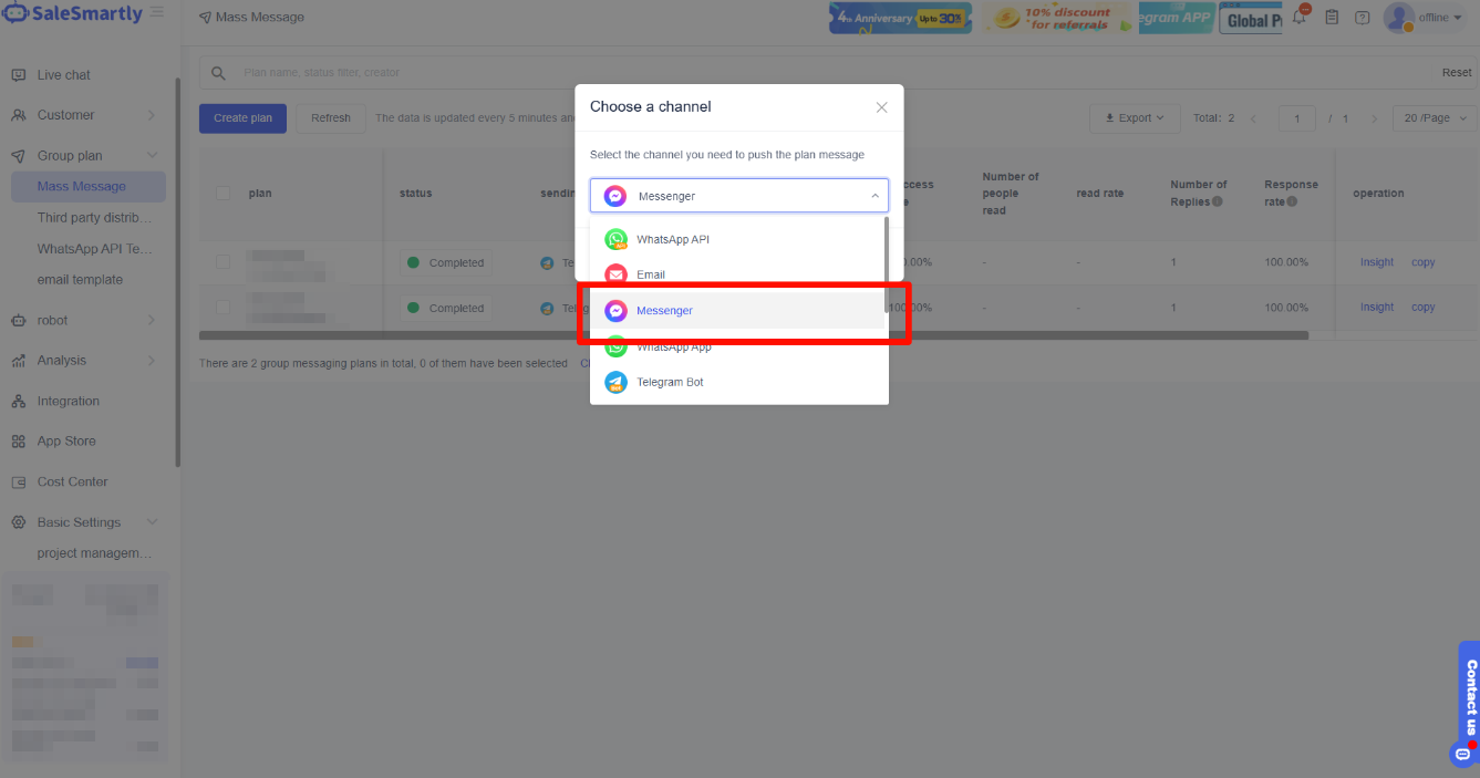 With this feature, you can create group messaging plans on multiple channels including WhatsApp App, WhatsApp API, Email, Messenger, Telegram, Instagram, LINE, and chat plug-ins.