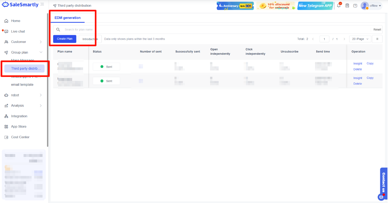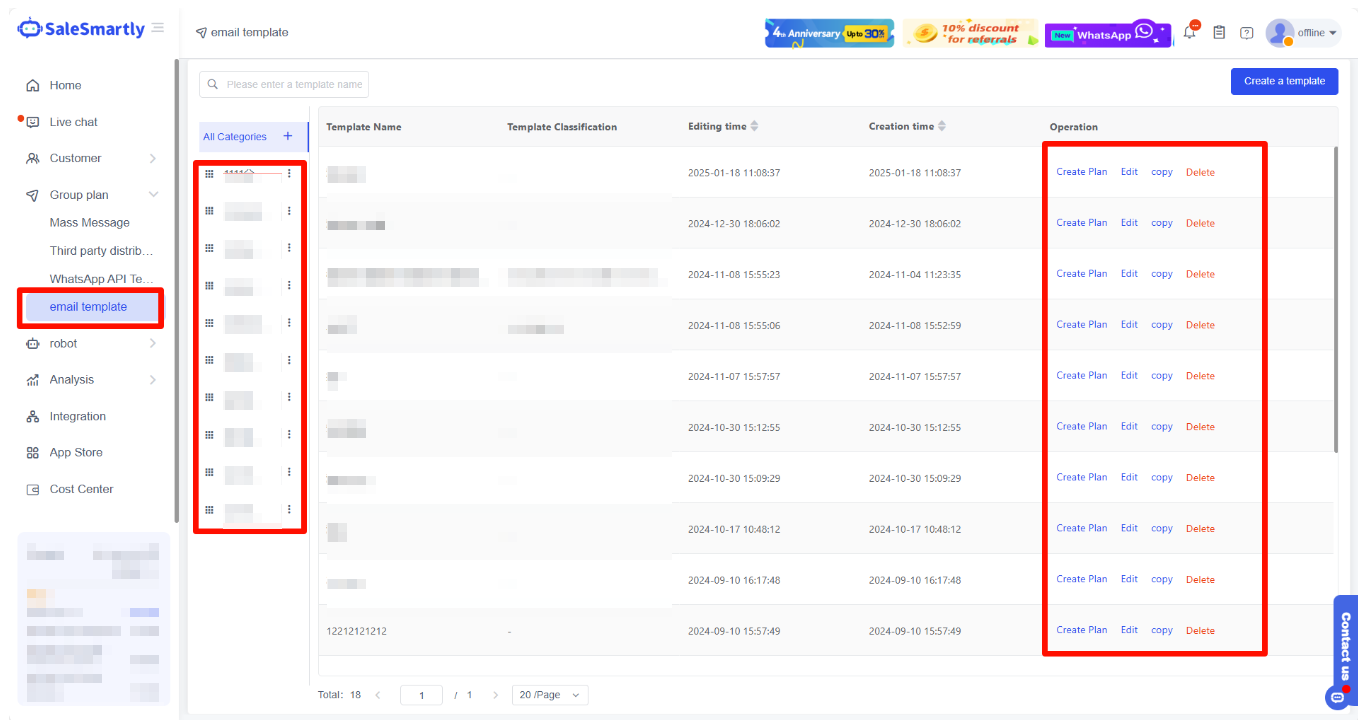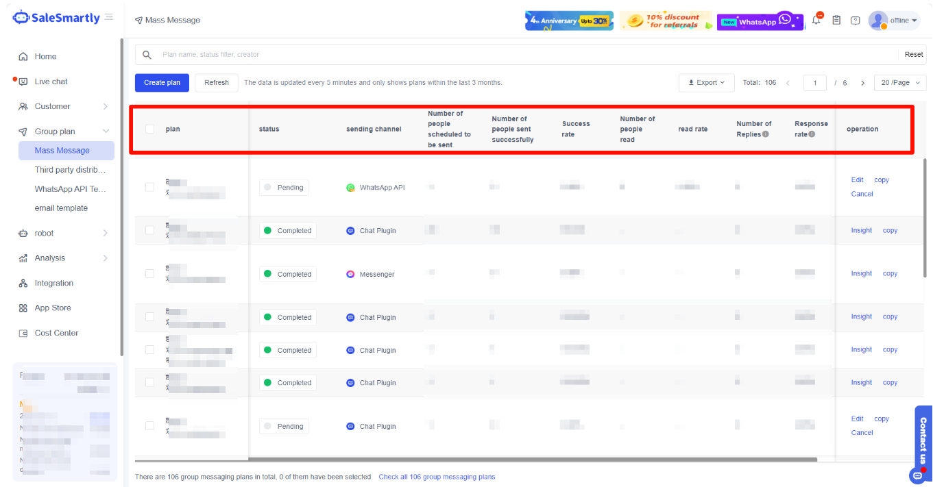 The mass messaging plan includes the mass messaging function of various channels and the template creation function of WhatsApp and Email. Mass messaging can not only save costs but also improve the efficiency of information transmission and recall lost users. This chapter mainly introduces the core functions of the mass messaging plan to help you get started quickly.