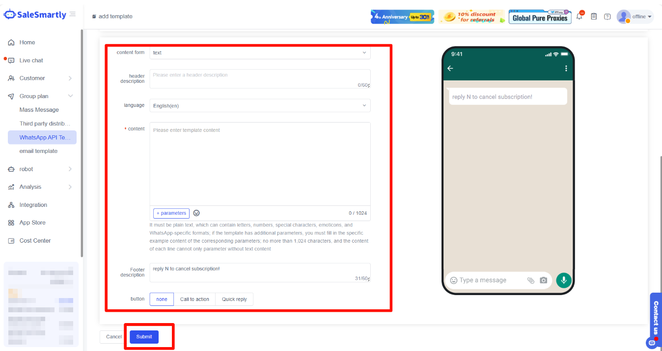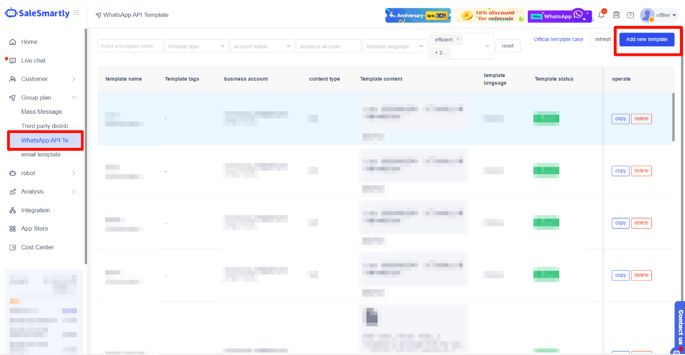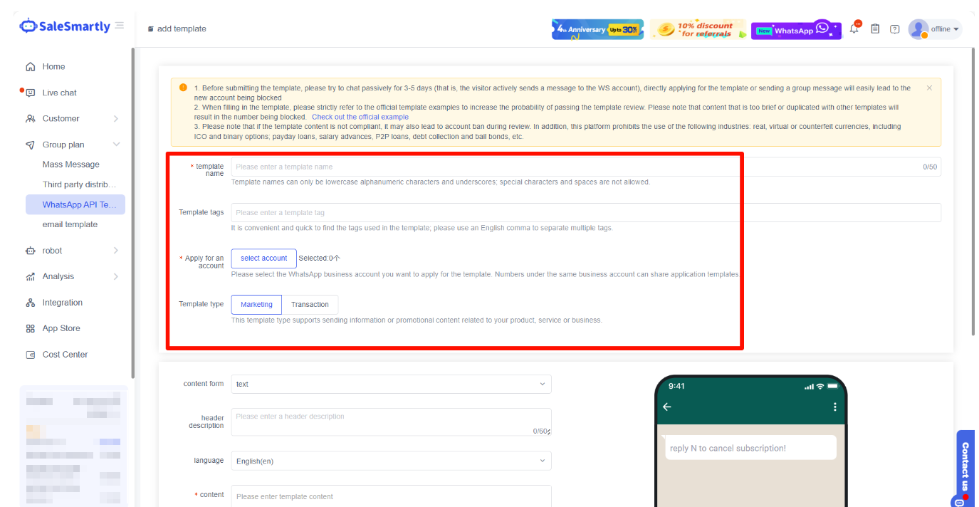 SaleSmartly supports the creation of WhatsApp API templates, which can be applied to the WhatsApp API channel for group messaging. Templates can improve the editing efficiency of group messaging and promote marketing.