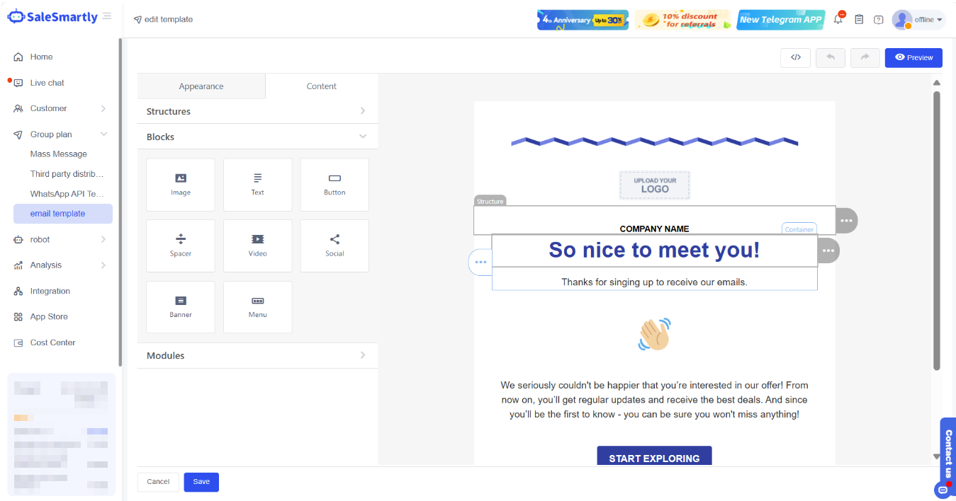 You can edit the Email template at Email template. The system comes with several practical marketing Email templates, which you can edit freely.