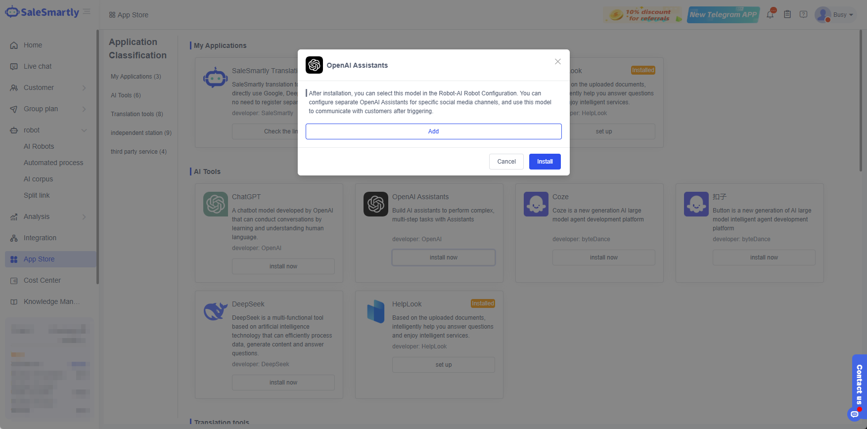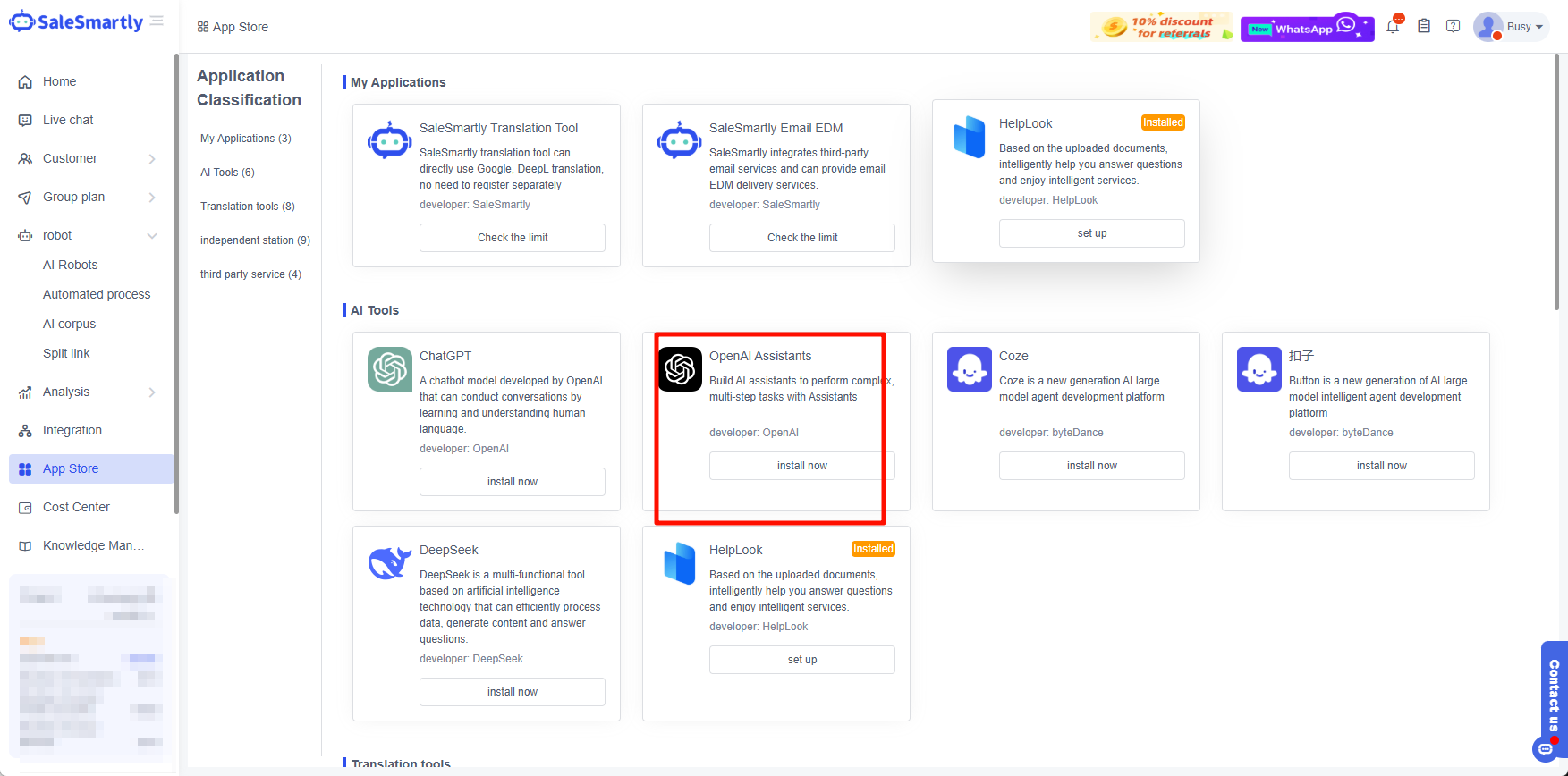 - Đăng nhập vào SaleSmartly, mở App Store - AI Tools - OpenAI Assistants, và nhấp vào Cài đặt Ngay bây giờ.