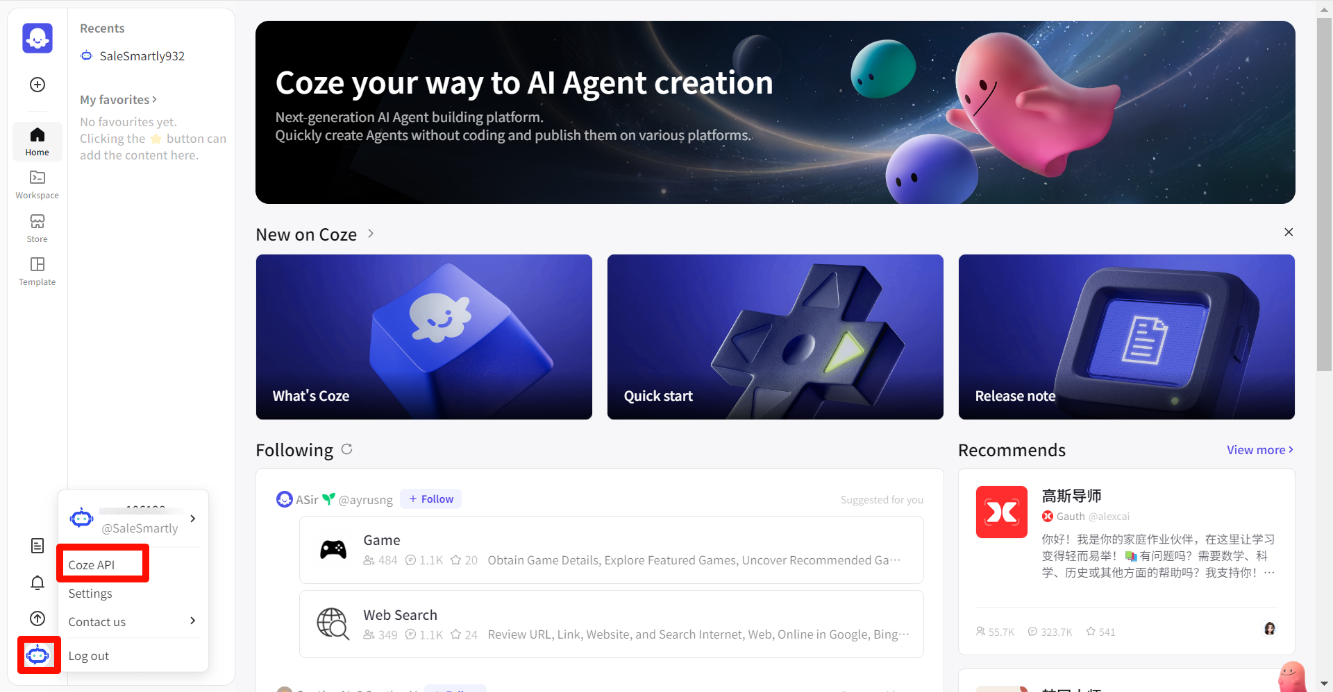 Sau khi đăng nhập thành công, mở trang chủ phiên bản quốc tế của Coze và tìm API Coze ở góc dưới bên trái. Vị trí có thể khác nhau tùy phiên bản. Bạn có thể tham khảo hai hình ảnh sau:
