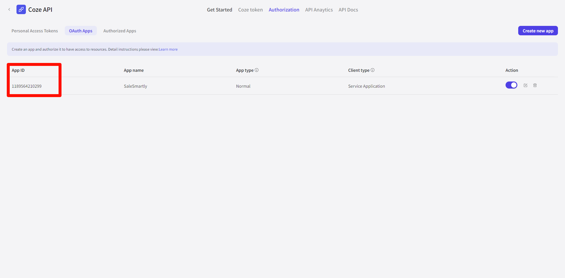 Sau khi tạo thành công, hệ thống sẽ tự động quay lại trang Authorization, nơi APP ID chính là Client ID chúng ta cần sau này.