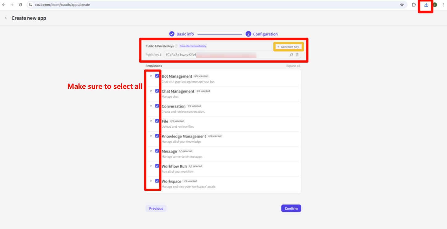 Nhấp Generate Key, Public Keys sẽ được tạo trong khung đỏ và file pem sẽ tự động tải xuống. Đảm bảo chọn tất cả các tùy chọn.