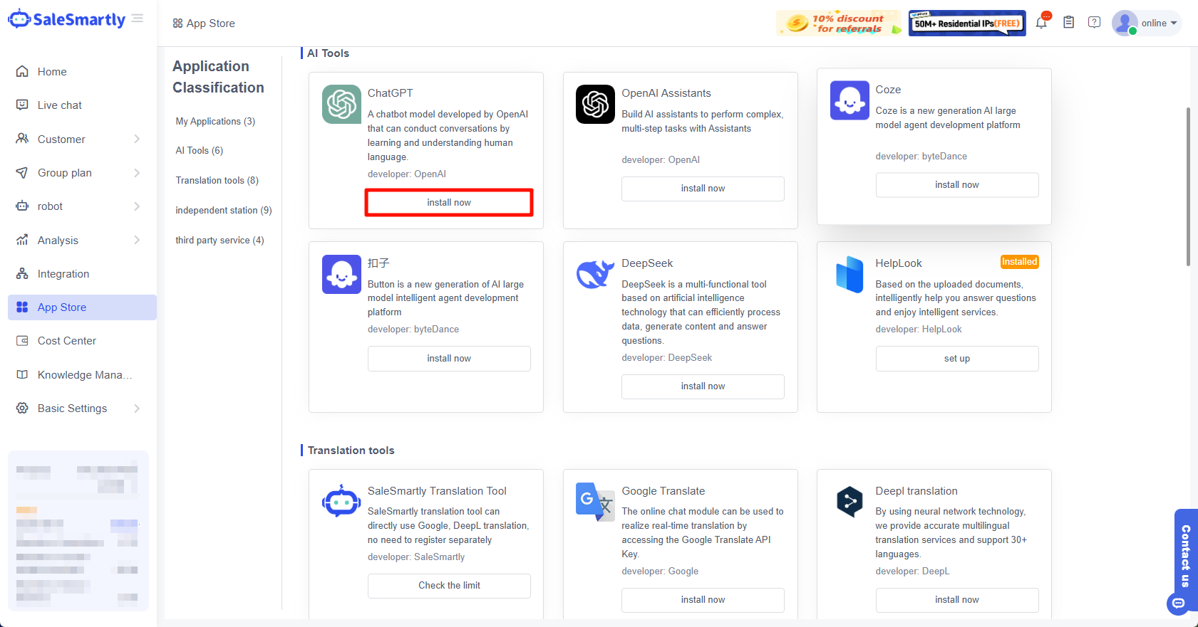 - Đăng nhập SaleSmartly, mở Cửa hàng ứng dụng - Công cụ AI - ChatGPT, và nhấp Cài đặt ngay.