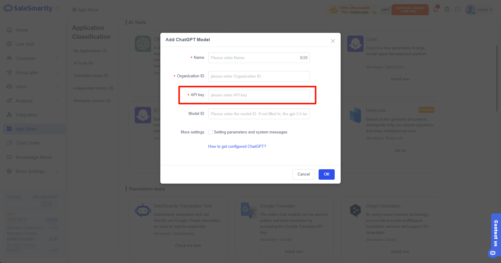 - Sao chép khóa API và dán vào SaleSmartly. Cuối cùng nhấp nút Cài đặt để hoàn tất cấu hình ChatGPT.
