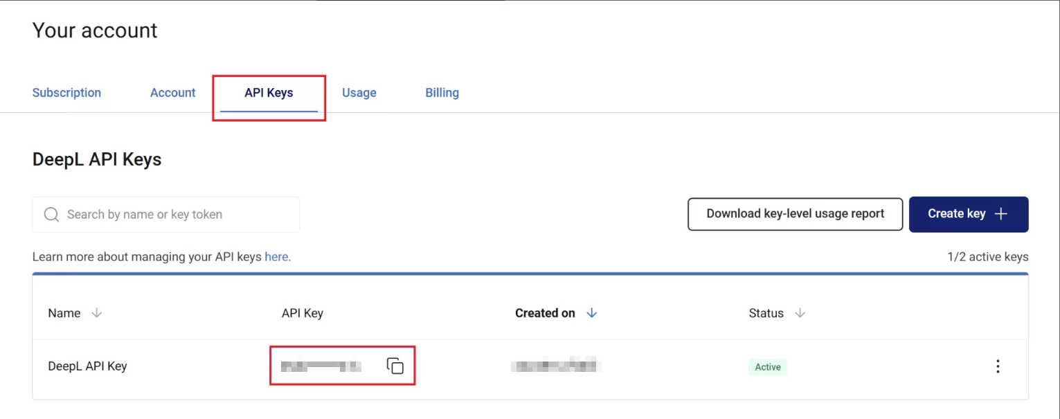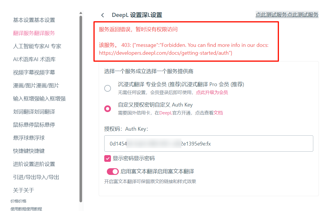 ⚠️ Nếu bạn mua khóa API từ bên thứ ba (ví dụ: Taobao), khóa có thể không hợp lệ hoặc bị hạn chế. Chúng tôi khuyến nghị mạnh mẽ nên lấy khóa API trực tiếp từ trang web chính thức của DeepL để đảm bảo tính hợp lệ.