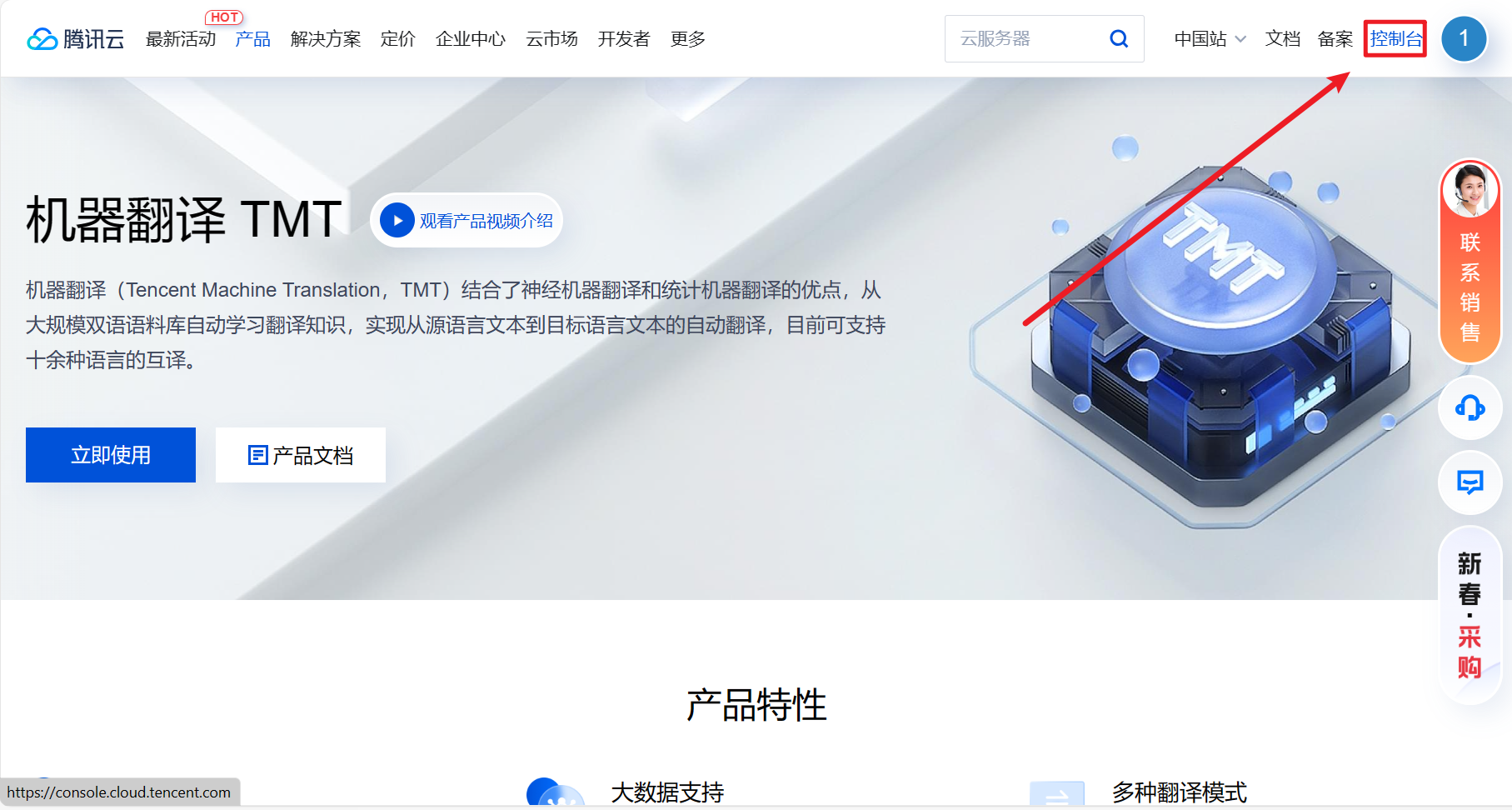 Sau khi đăng nhập thành công, nhấn Console để vào bảng điều khiển dịch thuật Tencent Cloud.