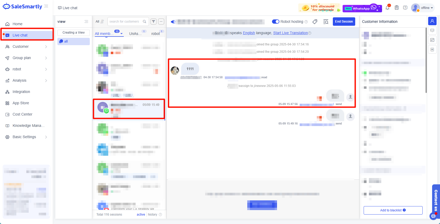 Mỗi phiên trò chuyện có thời hạn 24 giờ. Nếu không có tương tác sau 24 giờ, bạn phải gửi lại nội dung mẫu.