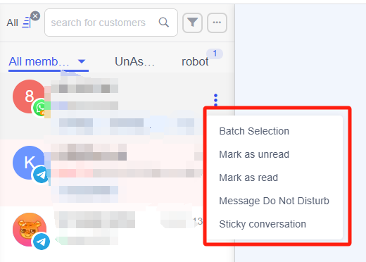 Trong danh sách phiên, bạn có thể chọn hàng loạt, đánh dấu là chưa đọc/đã đọc và ghim cuộc trò chuyện lên đầu, giúp bạn dễ dàng quản lý danh sách trò chuyện trong quá trình sử dụng.