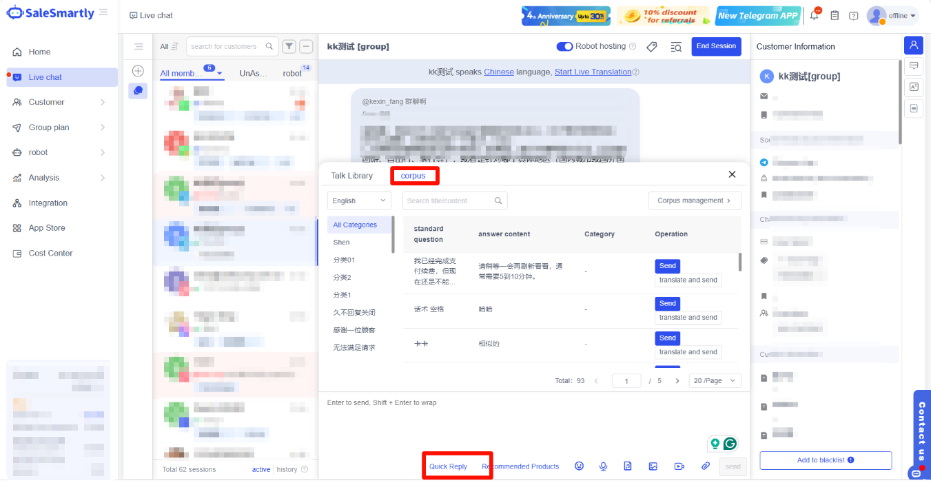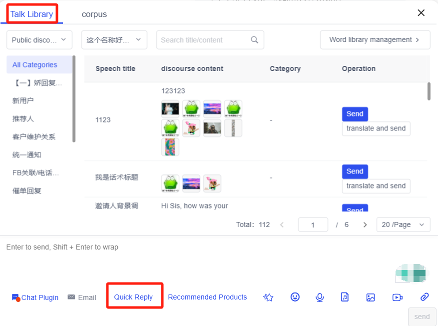 Trong quá trình trò chuyện, bạn có thể nhấp vào bên phải thư viện kịch bản để gửi các cụm từ thông dụng. Đồng thời, bạn cũng có thể nhấp vào phản hồi nhanh bên dưới cửa sổ trò chuyện để mở rộng thư viện kịch bản, nâng cao tính chuyên nghiệp và độ chính xác của phản hồi nhân viên chăm sóc khách hàng.