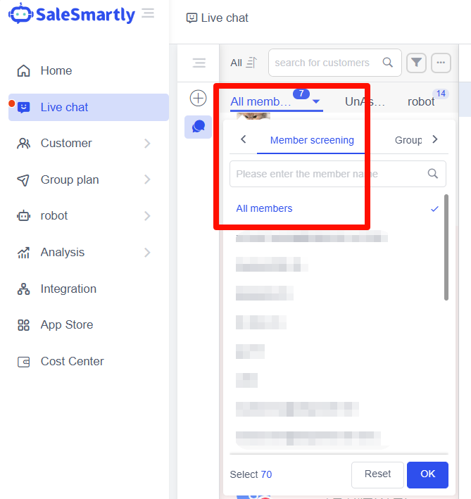 Bạn có thể chọn Phân công lại trong cột thông tin người dùng để phân công người dùng cho nhân viên chăm sóc khách hàng khác. Tuy nhiên, chức năng này yêu cầu quyền để sử dụng. Đối với các vấn đề về quyền, vui lòng kiểm tra cài đặt Thiết lập-Đội nhóm.