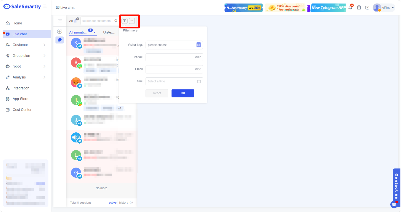 - Nhấp vào biểu tượng phễu ở bên trái để lọc khách hàng dựa trên nhãn khách truy cập, số điện thoại, thời gian trả lời cuối cùng và địa chỉ email, giúp bạn tìm kiếm khách hàng nhanh chóng.