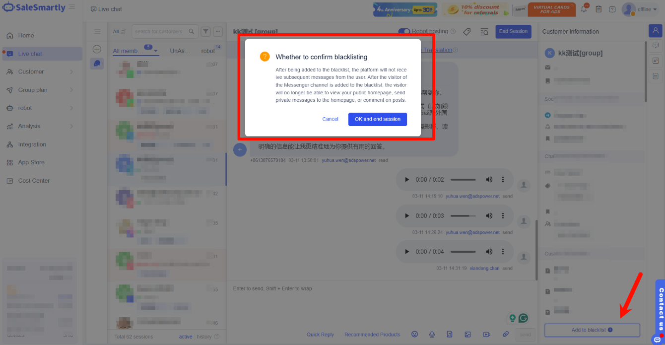 Đối với khách hàng thường xuyên đăng bình luận ác ý trên trang Facebook của người bán, thường xuyên gửi tin nhắn riêng không hợp lý, cố ý lan truyền thông tin sai lệch hoặc phỉ báng người bán, người bán có thể chọn chặn những khách hàng này bằng một cú nhấp trong giao diện trò chuyện để ngăn chặn sự quấy rối ác ý tiếp theo, bảo vệ lợi ích của chính họ và tránh sự quấy rối ác ý.