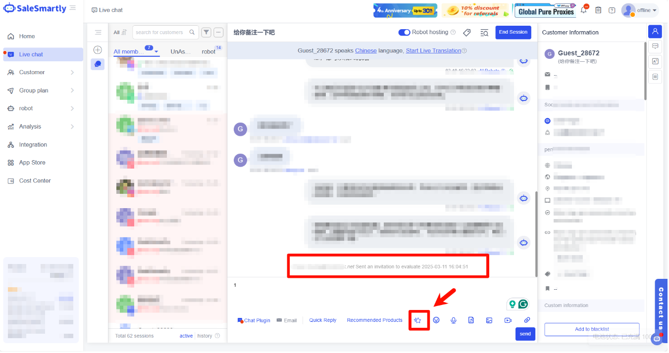 Dịch thời gian thực: Nhấp để bắt đầu chức năng dịch trực tuyến, bạn có thể chọn ngôn ngữ mà khách hàng sử dụng và thiết lập ngôn ngữ bạn sử dụng, tin nhắn giữa hai bên sẽ được tự động dịch để thuận tiện cho giao tiếp đa ngôn ngữ và nâng cao hiệu suất giao tiếp.