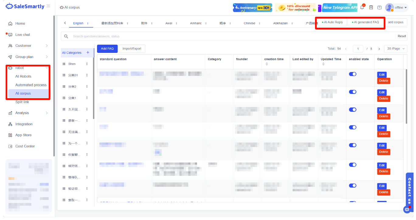 Bạn có thể thêm FAQ để thiết lập các cụm từ thông dụng và danh mục của bạn trong giao diện Robot-Ngữ liệu AI. Ngoài việc thêm FAQ trong trang cài đặt Ngữ liệu AI, bạn cũng có thể thêm FAQ cho một tin nhắn cụ thể trong giao diện Trò chuyện trực tuyến, điều này thuận tiện và nhanh chóng để làm phong phú cơ sở kiến thức. Sử dụng tốt FAQ có thể nâng cao đáng kể hiệu suất phản hồi của nhân viên chăm sóc khách hàng.