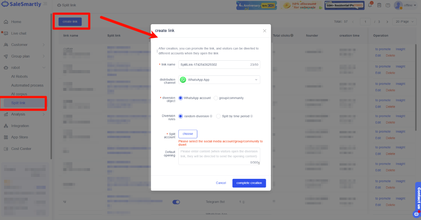 Trên trang Liên kết Chuyển hướng Marketing, nhấp vào Tạo Liên kết > Chỉnh sửa tên liên kết, kênh phân phối (chia thành Telegram Bot, WhatsApp API và WhatsApp APP) và tài khoản phân chia > Thiết lập lời mở đầu mặc định > Nhấp vào Hoàn tất Tạo để hoàn thành việc tạo liên kết chuyển hướng.