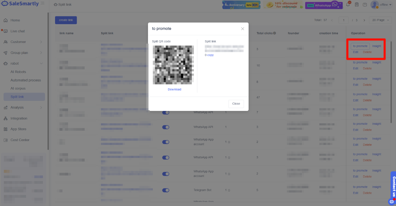 Bạn có thể chia sẻ liên kết chuyển hướng hoặc mã QR với khách hàng của mình, nhấp vào Quảng bá để lấy nó. Sau khi người dùng nhấp hoặc quét mã, họ có thể chuyển đến tài khoản WhatsApp chuyển hướng tương ứng.