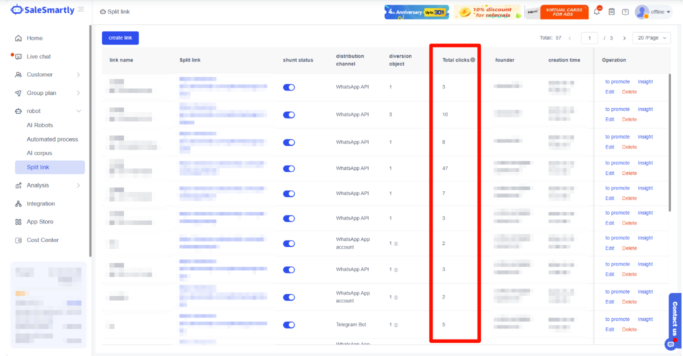 Trên trang Liên kết Chuyển hướng Marketing, bạn có thể tạo một liên kết chuyển hướng. Sau khi tạo, bạn có thể quảng bá liên kết này. Khi khách truy cập mở liên kết, họ có thể được chuyển hướng đến các nhóm/cộng đồng WhatsApp hoặc Telegram Bot khác nhau (trước tiên phải được ủy quyền WhatsApp API/WhatsApp APP/Telegram Bot).
