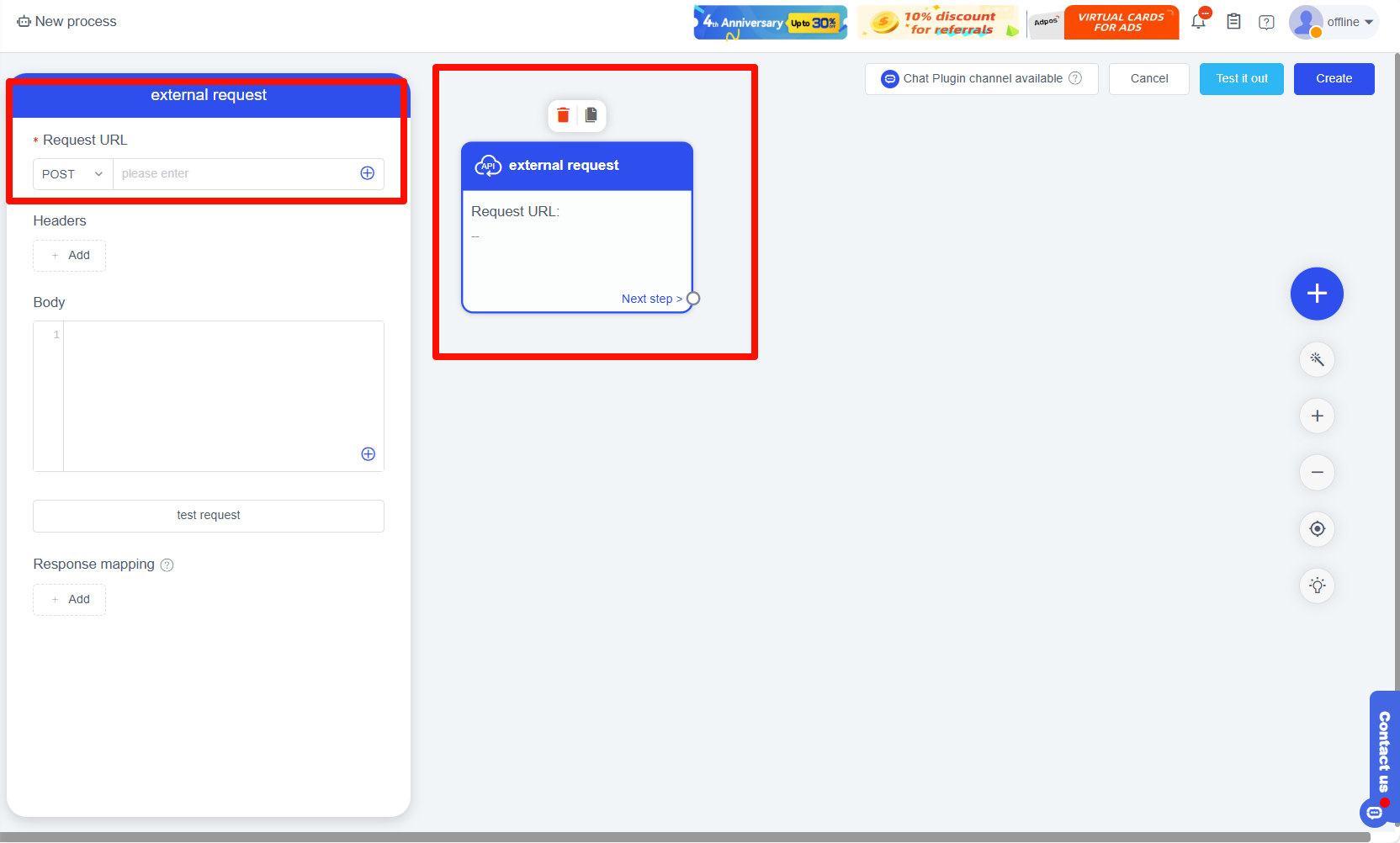 - Nhấp vào Yêu cầu Bên ngoài để mở cửa sổ cấu hình > Chọn phương thức yêu cầu (POST, GET, DELETE) > Điền URL yêu cầu theo nhu cầu.