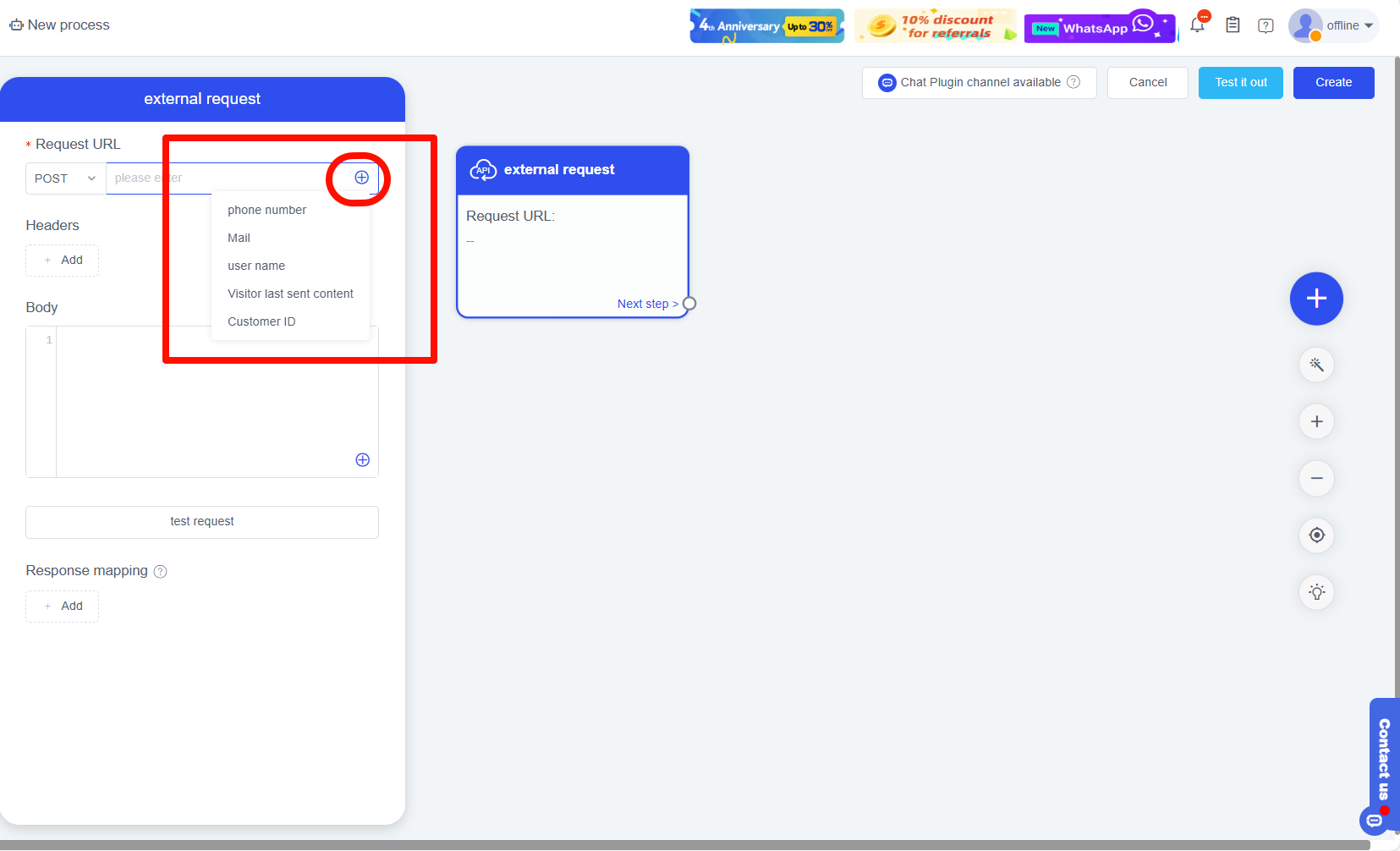 - Theo nhu cầu, bạn có thể thêm dữ liệu người dùng và gọi URL yêu cầu. Nhấp vào dấu + > nhấp vào dữ liệu bạn muốn chuyển > và hoàn thành thêm. (Tùy chọn)