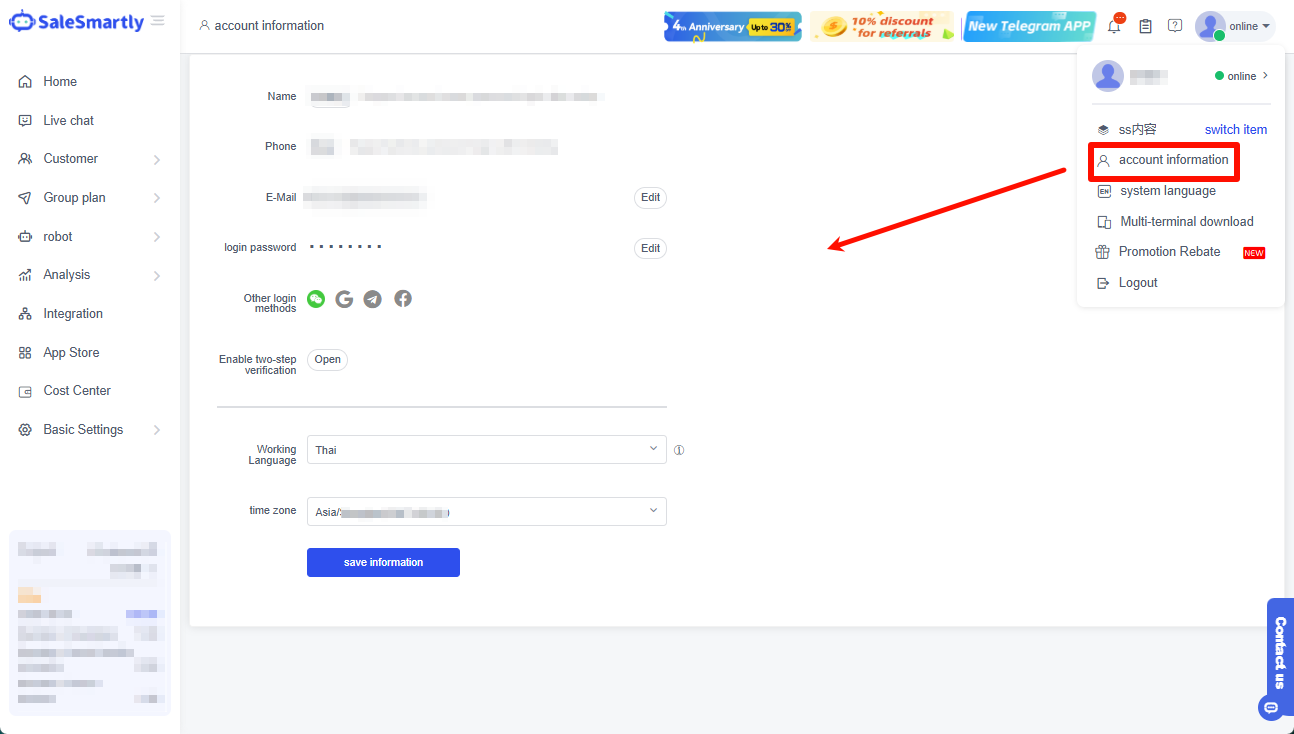 Hướng dẫn thiết lập dự án và quản lý thông tin cá nhân trên Salesmartly