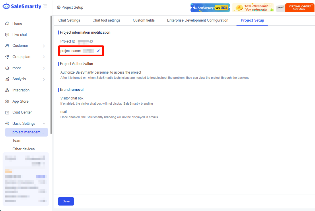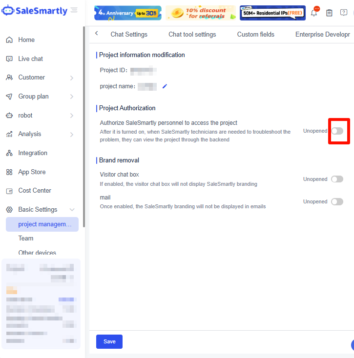 Trong Thiết lập dự án, bạn có thể bật quyền truy cập cho kỹ thuật viên SaleSmartly.